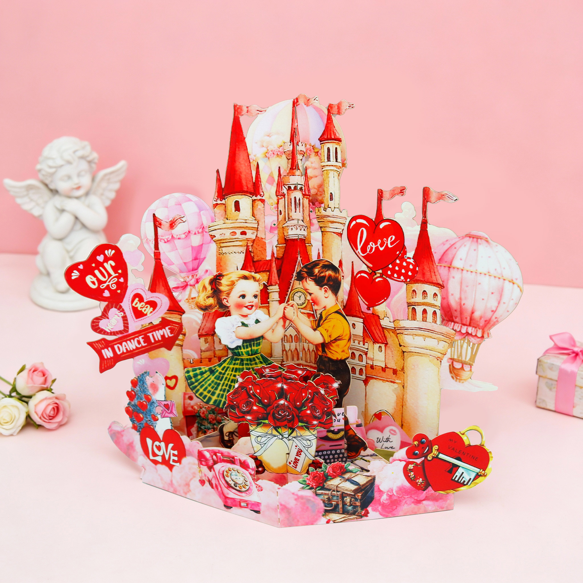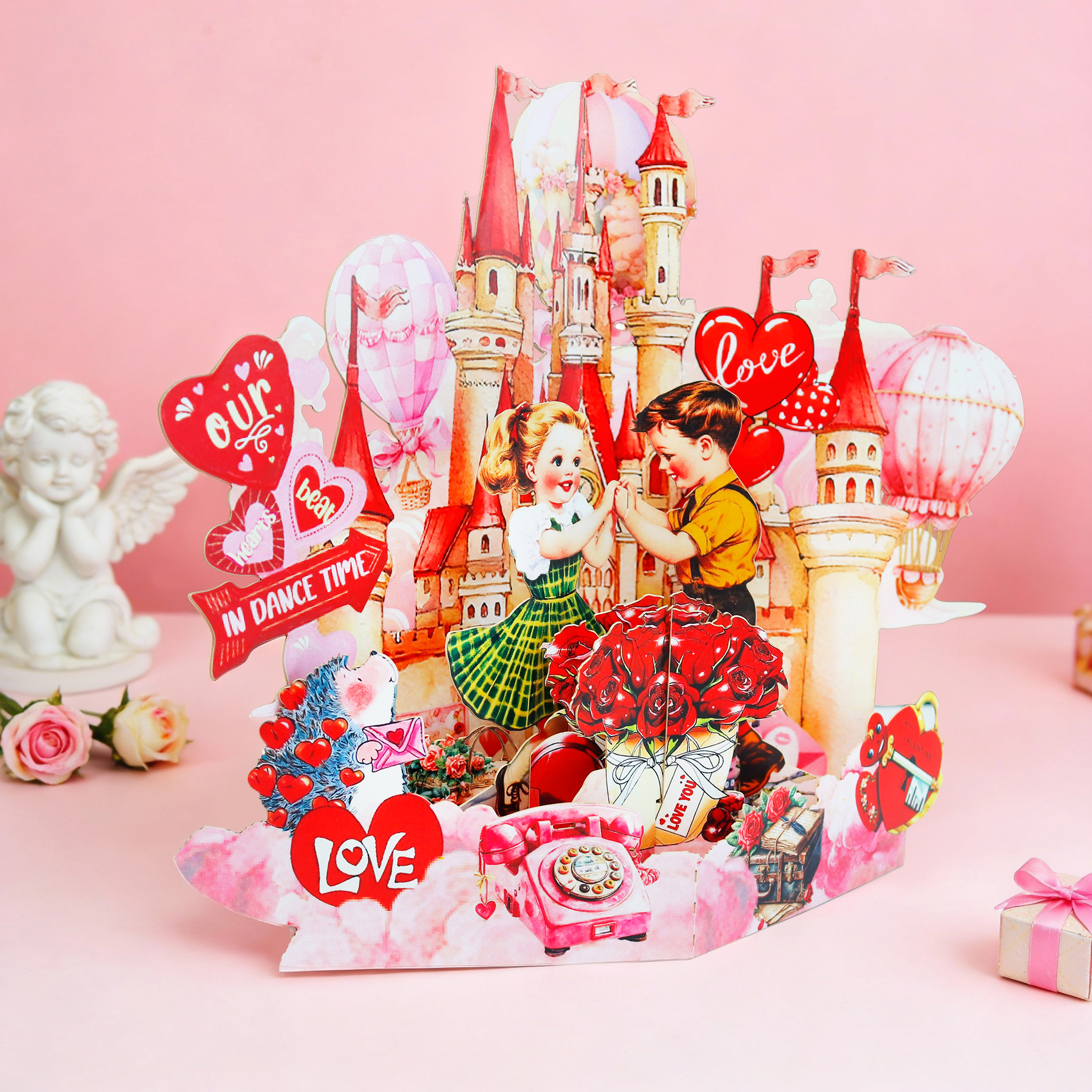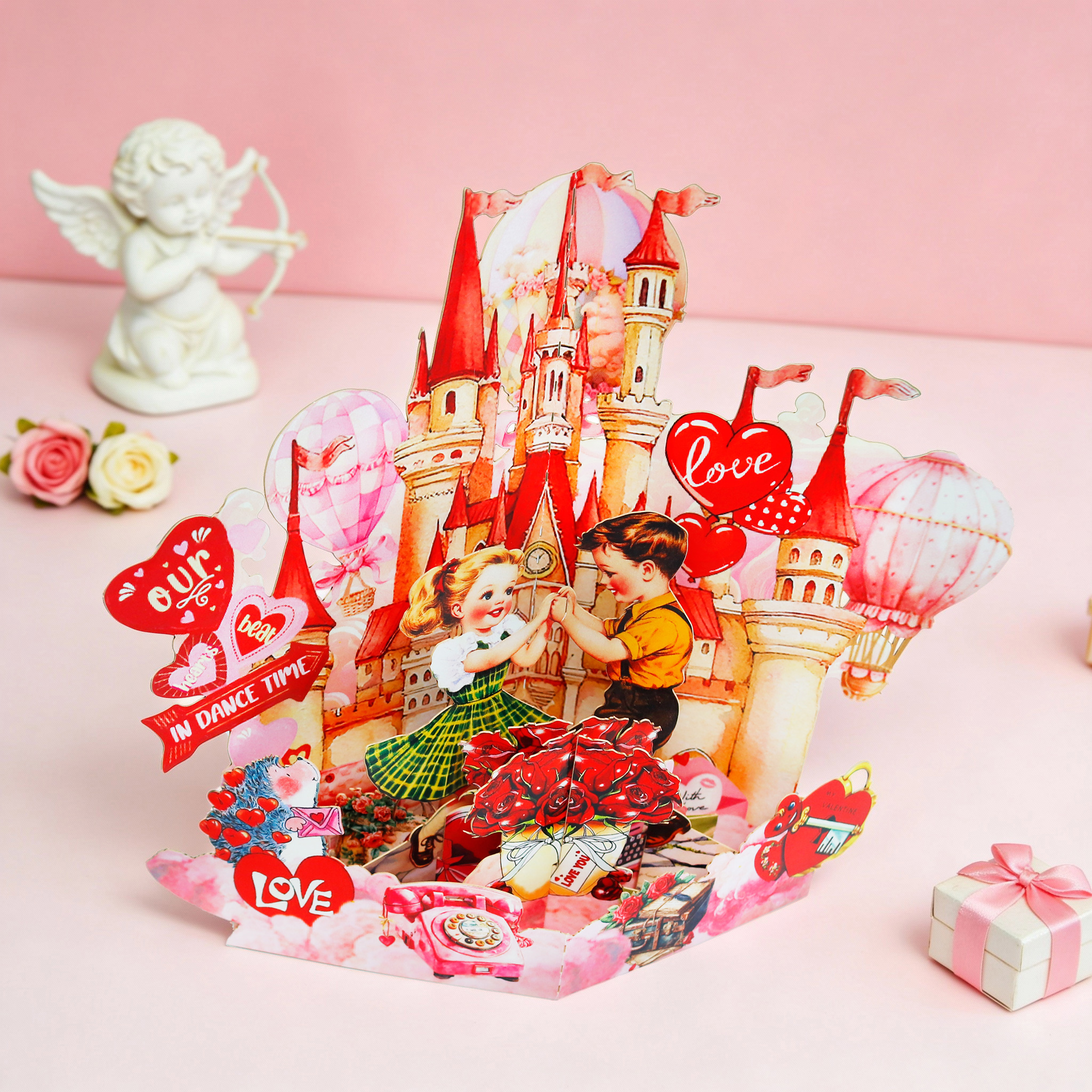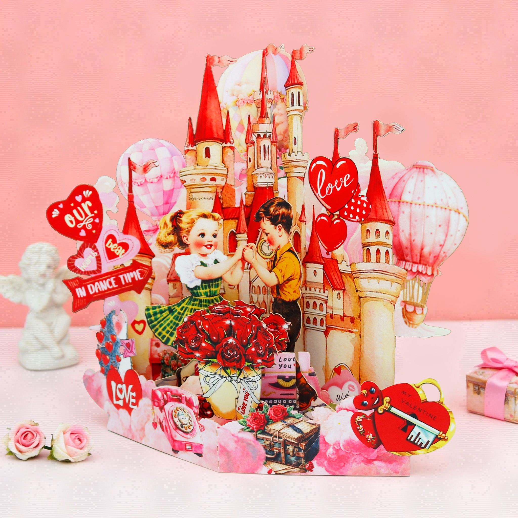 This 3D pop-up card unfolds into a layered fairy-tale castle scene, with an interactive couple figure as the core. It is adorned with romantic accents like love emblems (printed with “LOVE” and other phrases), pink hot air balloons, and a red rose bouquet. The base card adopts a soft pink-toned design, which fully highlights the sweet and dreamy romantic theme.