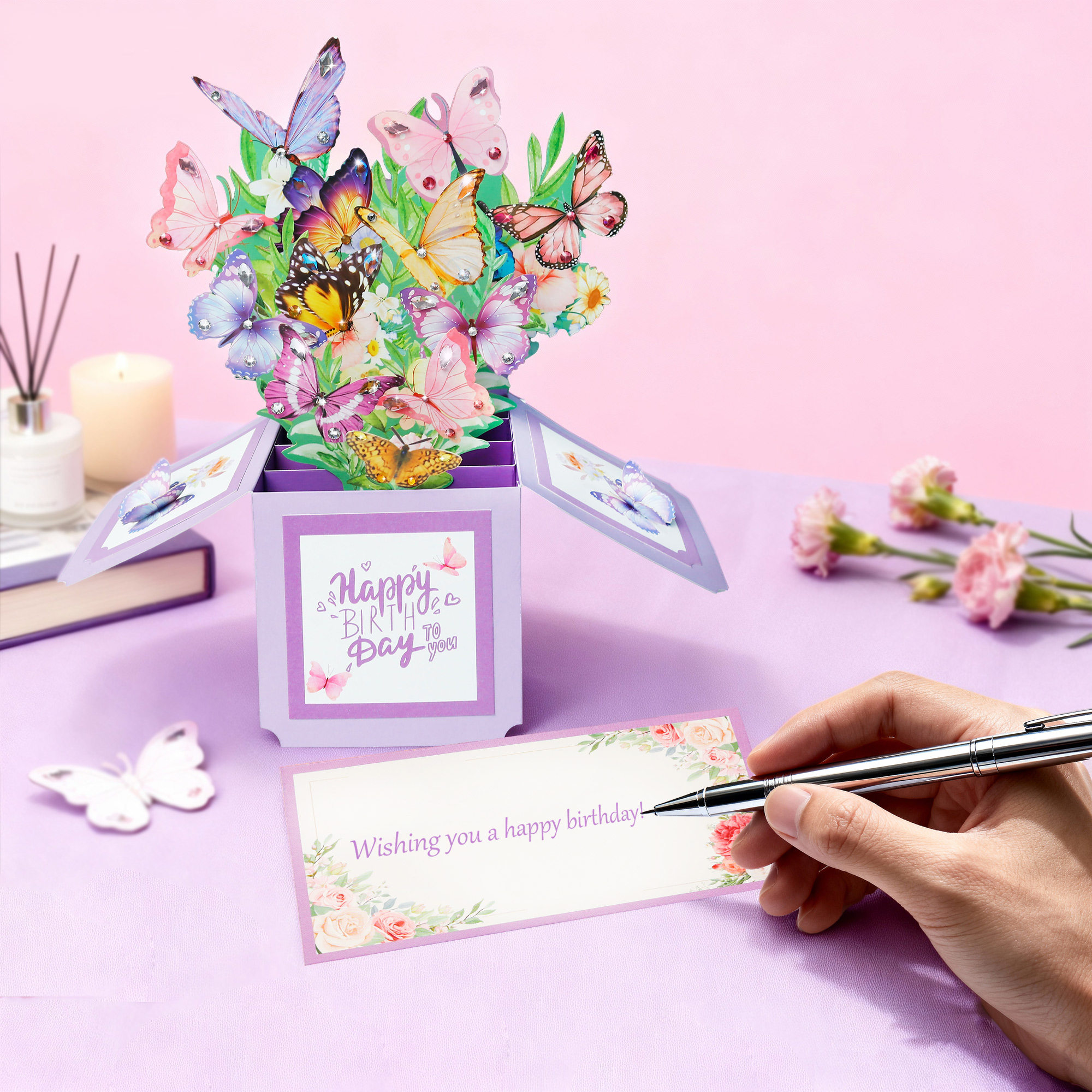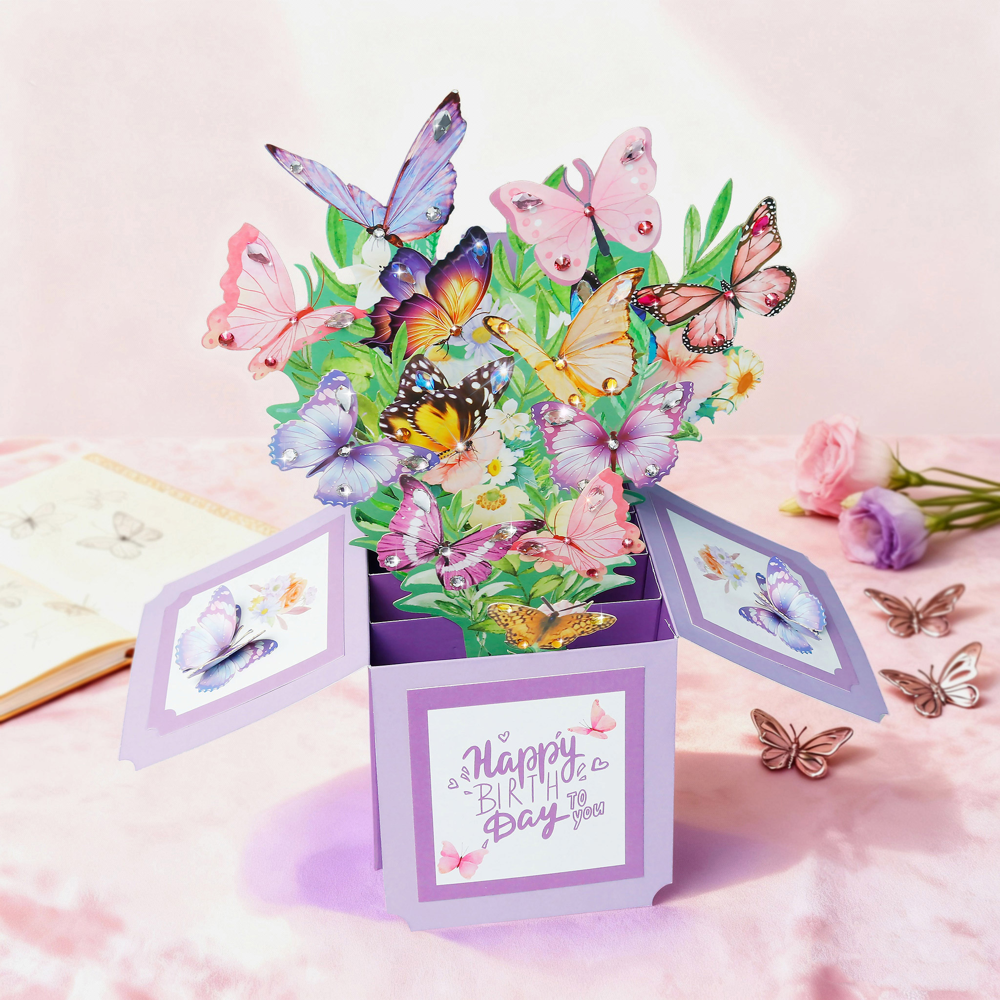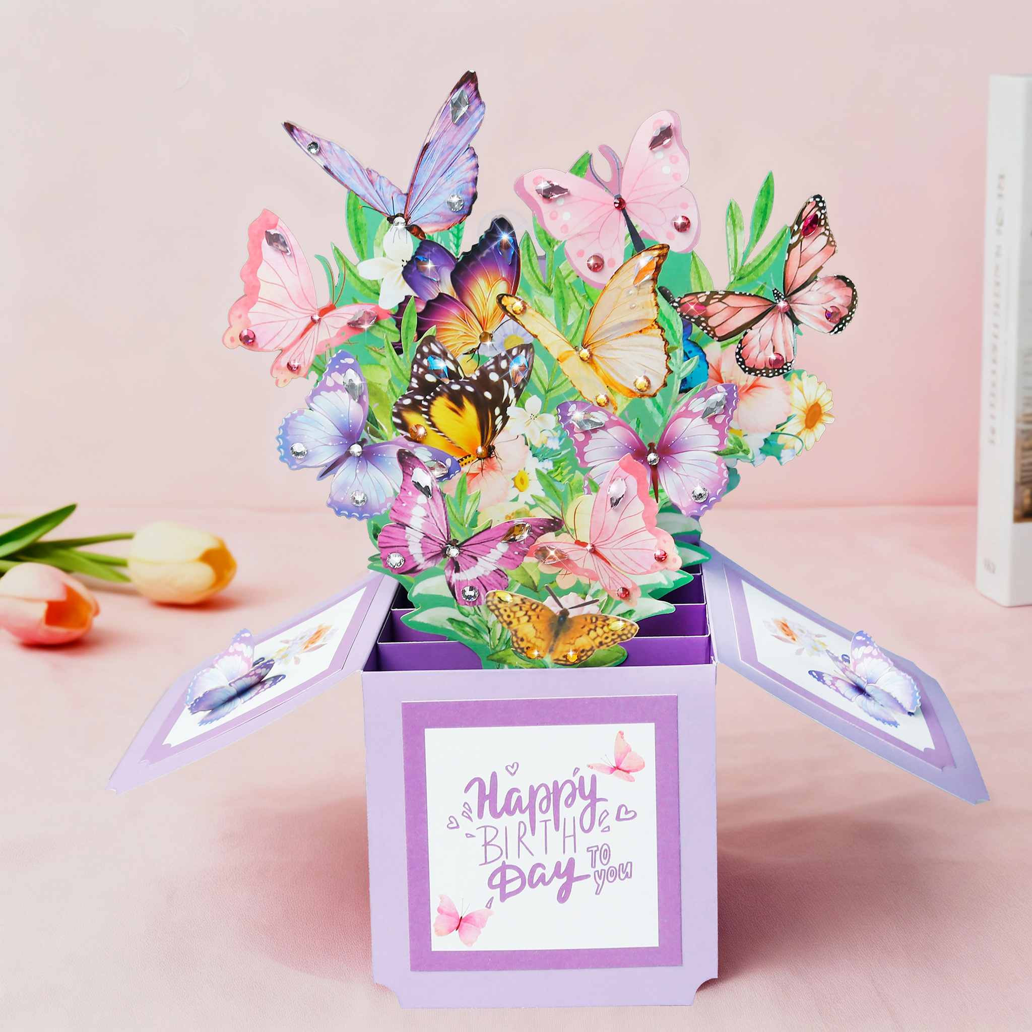 3D Pop-Up Diamond-Embellished Birthday-Themed Butterfly Bouquet Boxed Greeting Card
