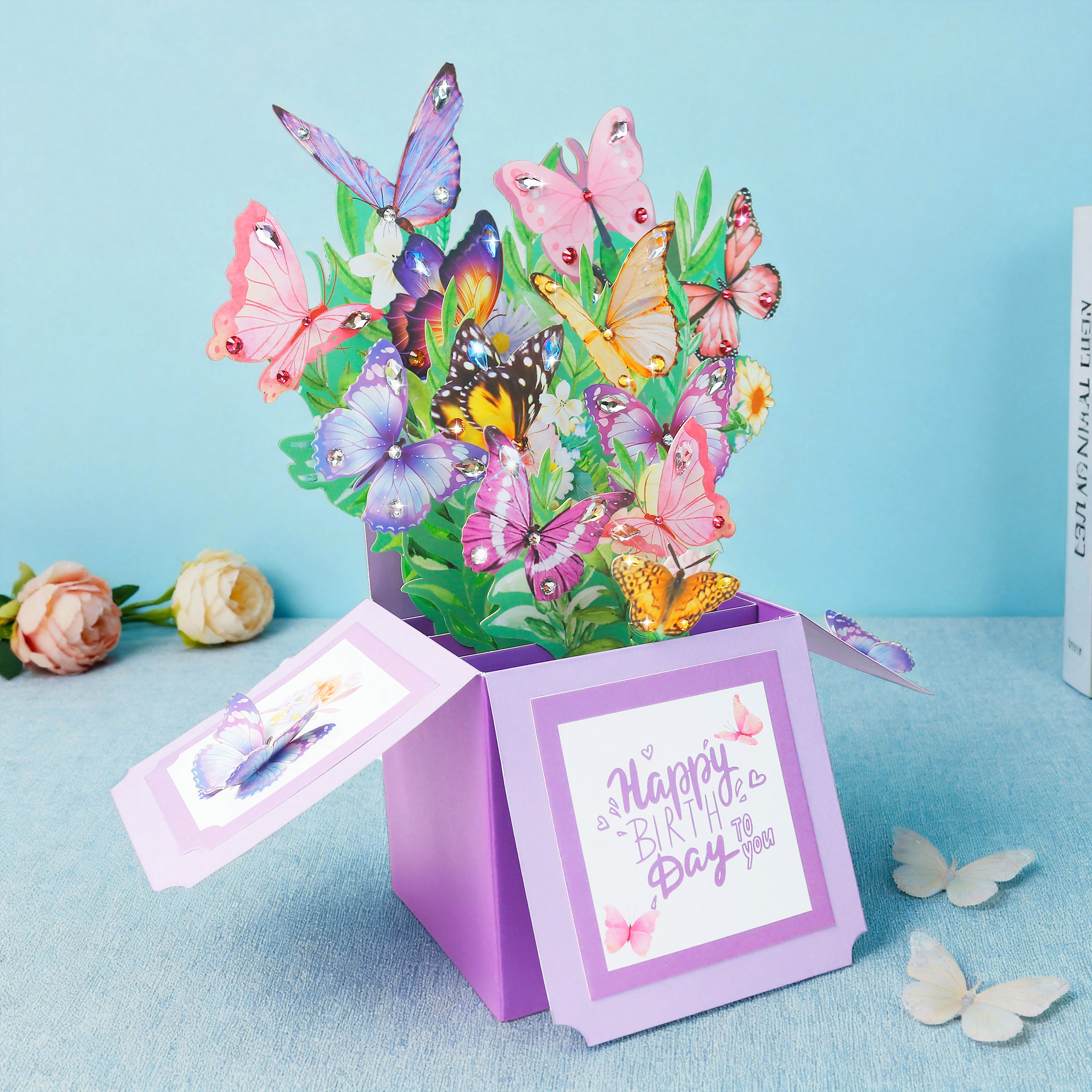 This 3D pop-up card unfolds into a layered butterfly bouquet structure inside a box, decorated with diamond-embellished colorful butterflies and floral accents. The box features a soft purple design paired with “Happy Birthday” wording, enhancing the romantic and joyful birthday theme.