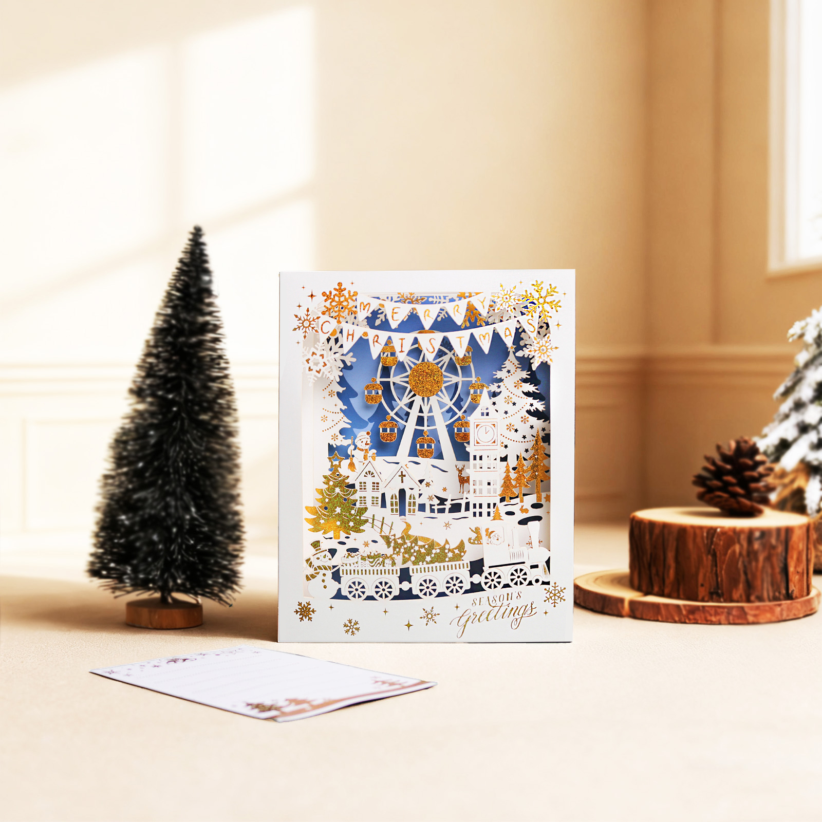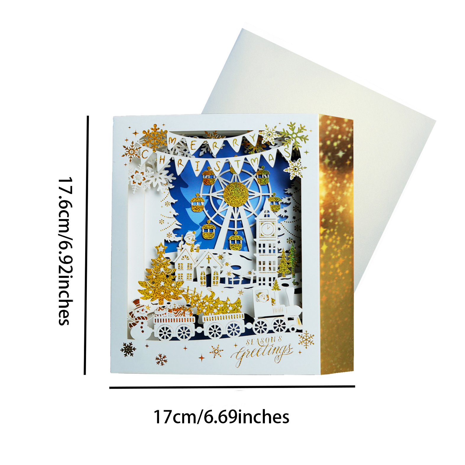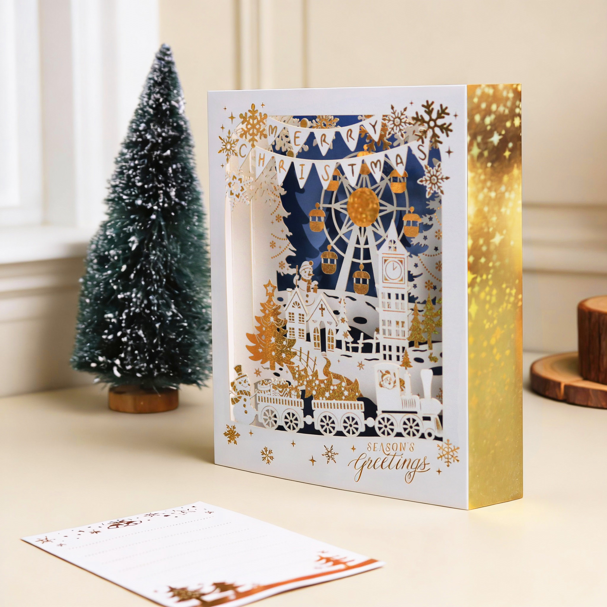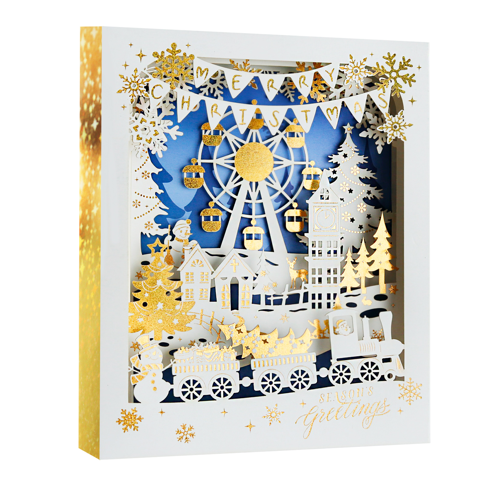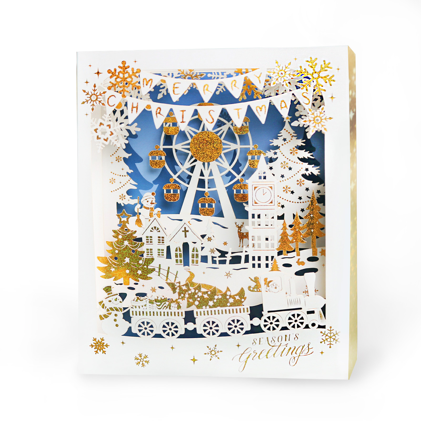 This 3D pop-up card presents a layered Christmas amusement park scene centered on a Ferris wheel. It features gold-plated ornaments and Ferris wheel details, with a light blue-and-white base color scheme; the gold foil stamping adds a lively and luxurious romantic touch