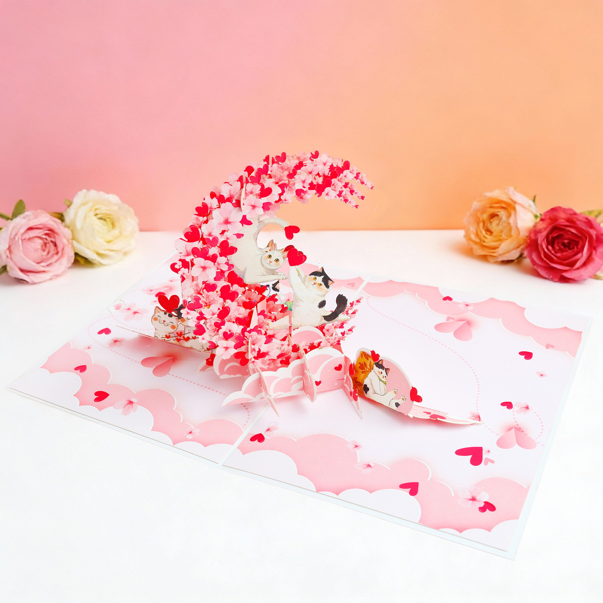 This 3D pop-up card unfolds into a layered heart-shaped structure, decorated with dense heart accents and cute cat figures. The base card features a soft pink heart pattern, which enhances the romantic and lovely theme.