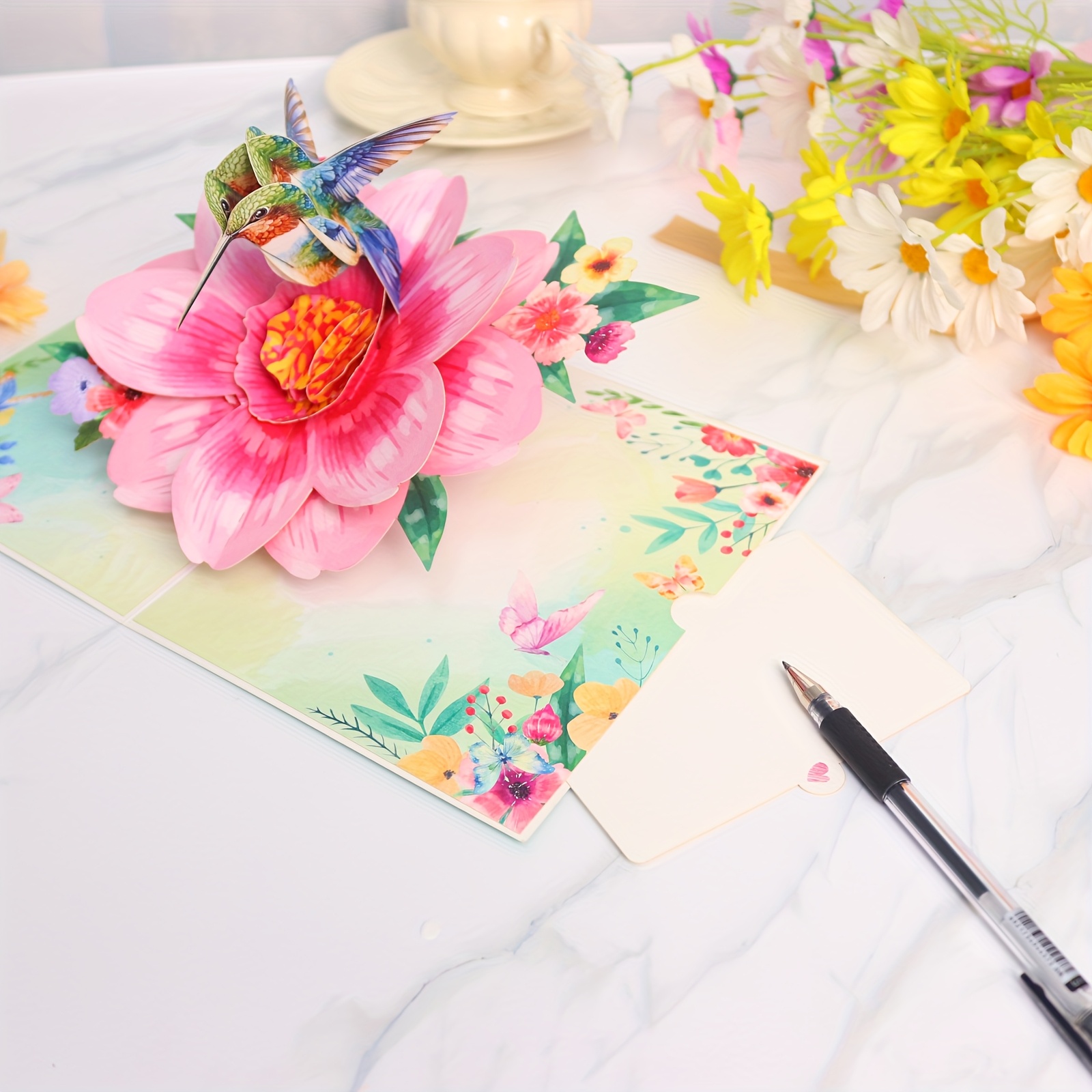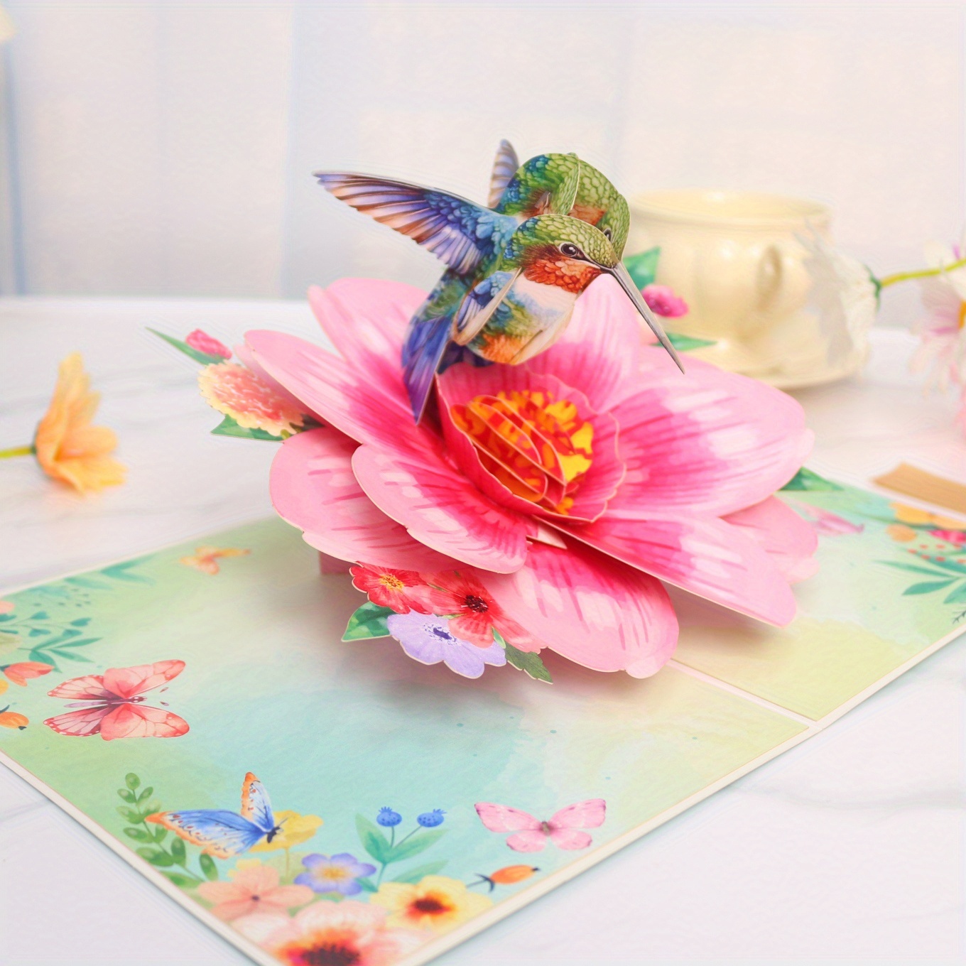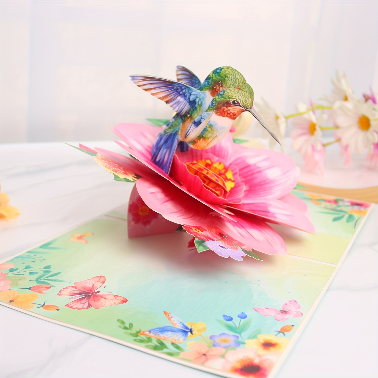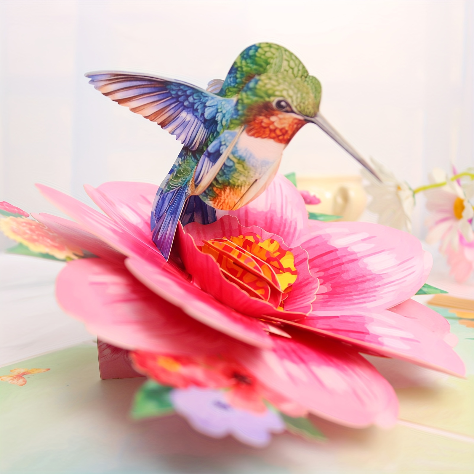 This 3D pop-up card unfolds into a vivid scene of a colorful hummingbird perched on a large pink flower, with matching floral and butterfly decorations on the background. Its lifelike 3D design is suitable for conveying fresh, warm wishes on occasions like daily greetings or small celebrations.