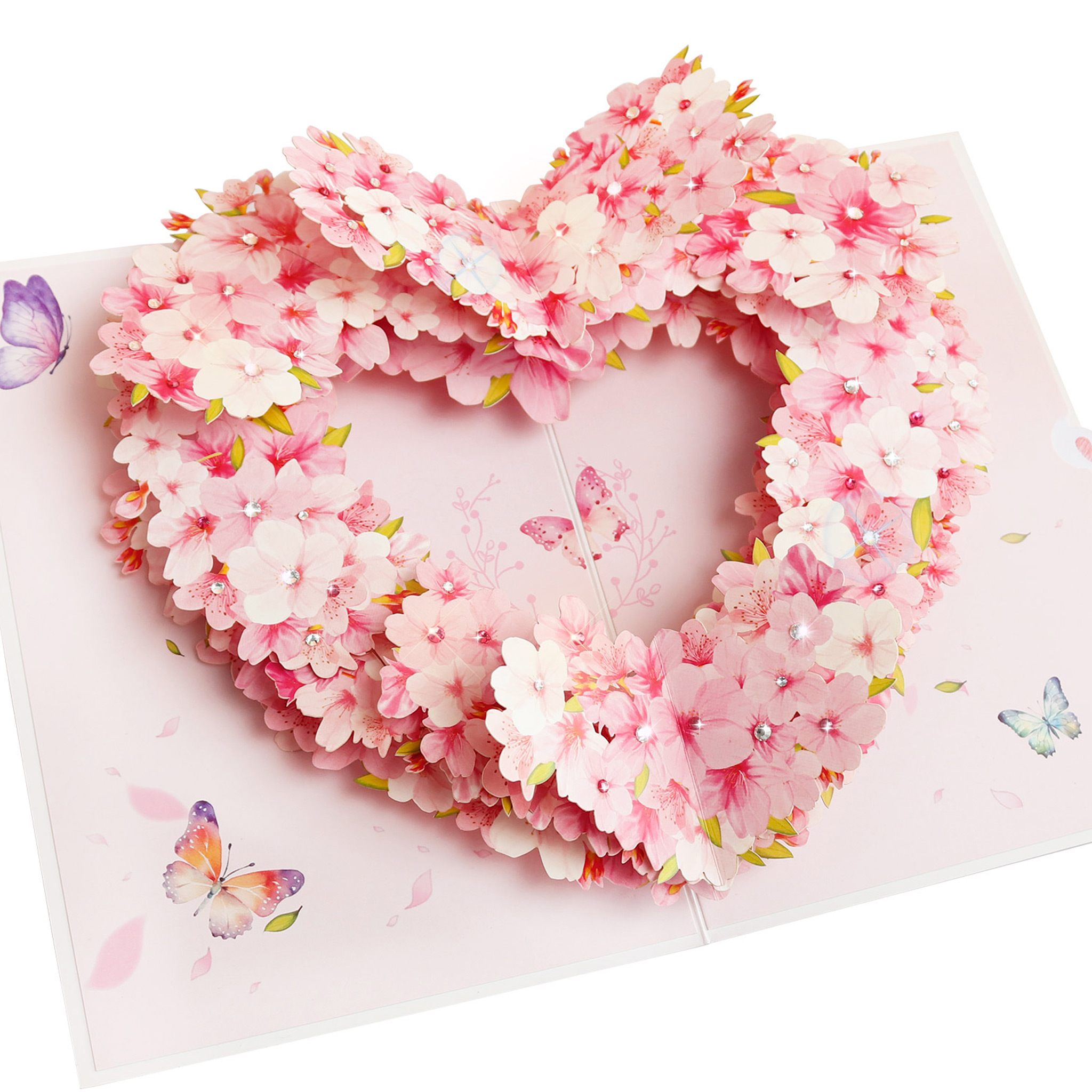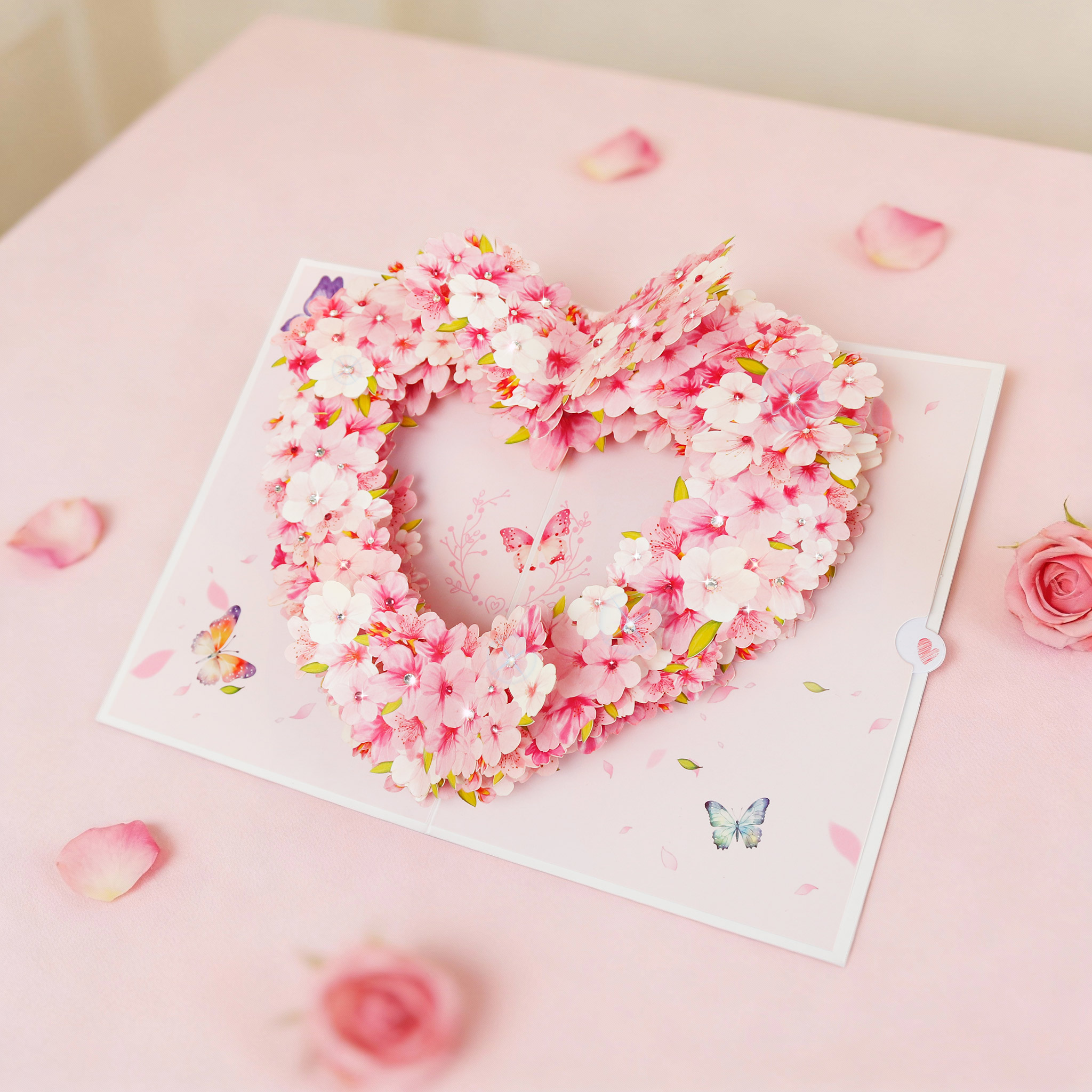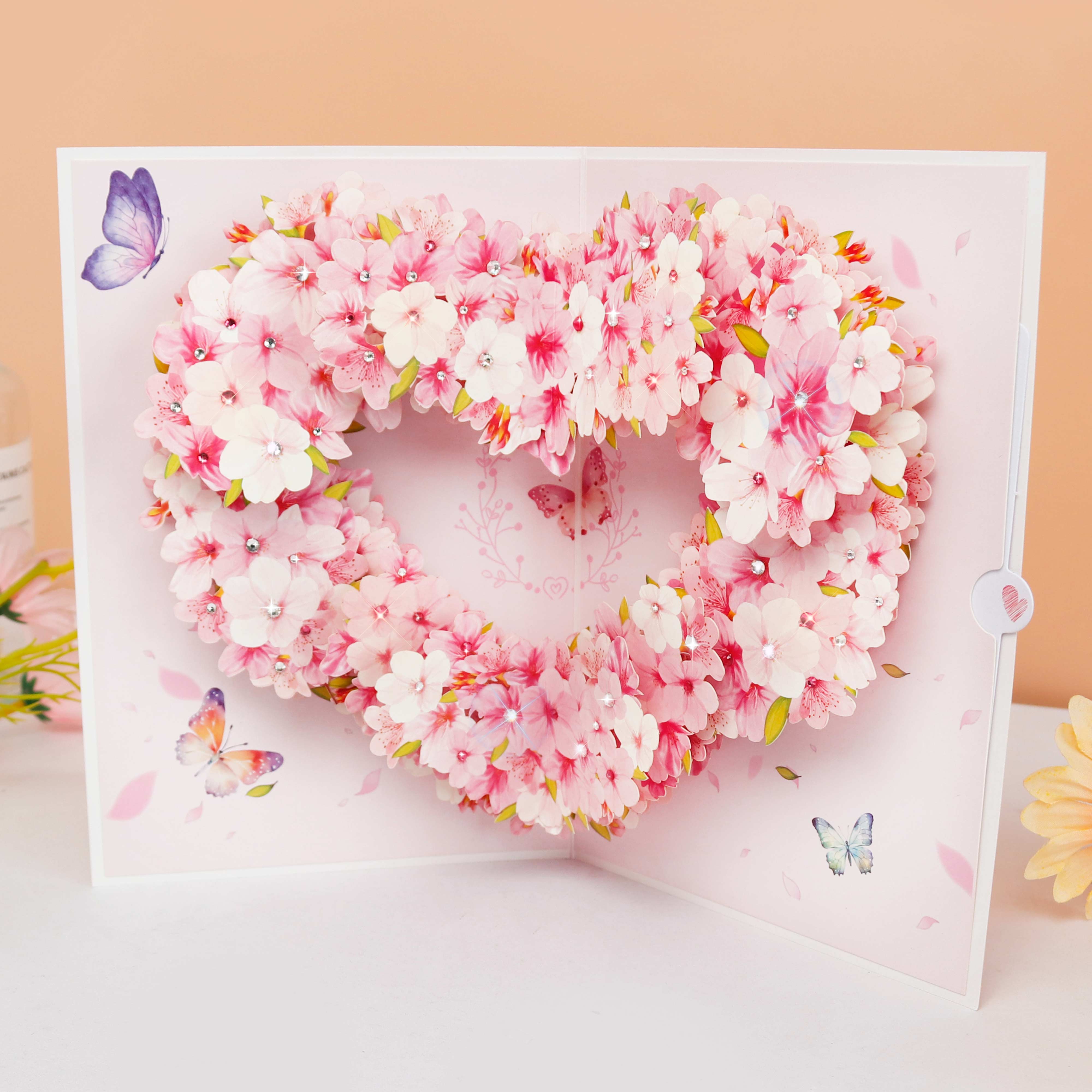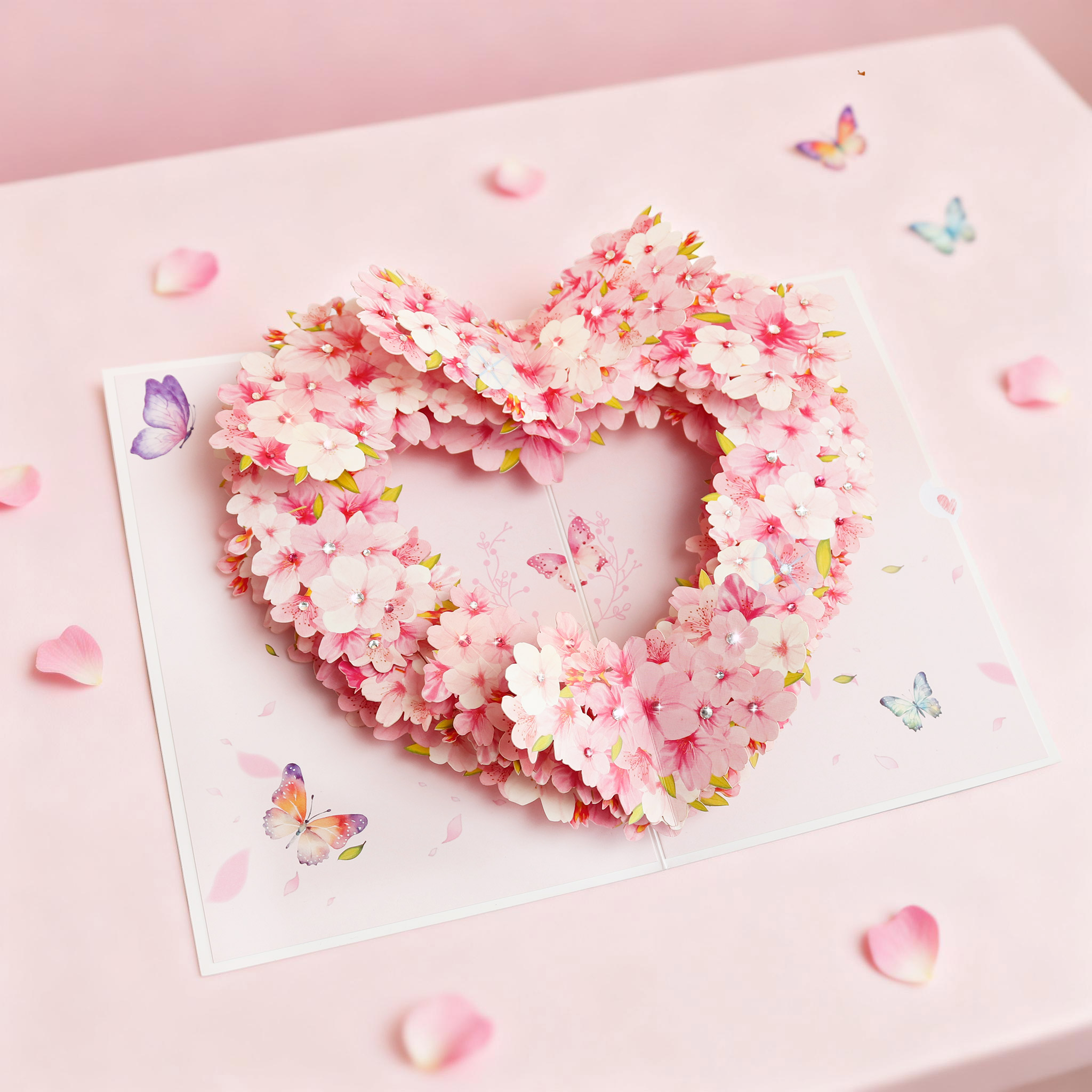 This 3D pop-up card unfolds into a romantic pink heart-shaped floral wreath scene, decorated with layered pink flowers, small diamond accents and butterfly ornaments. Its delicate 3D design (with heart-shaped elements) is especially suitable for conveying romantic wishes on occasions like Valentine’s Day, anniversaries or confession greetings.