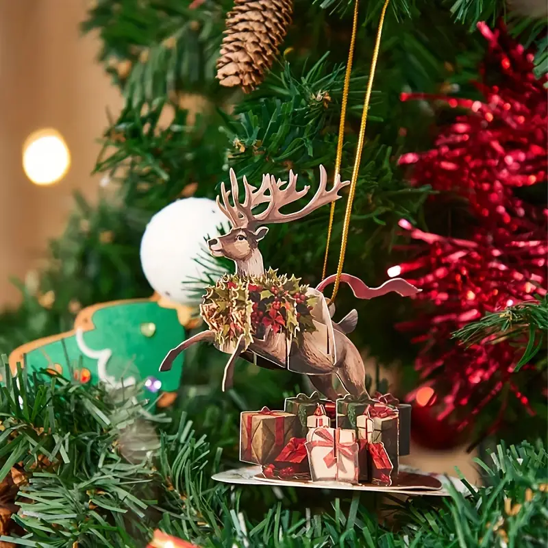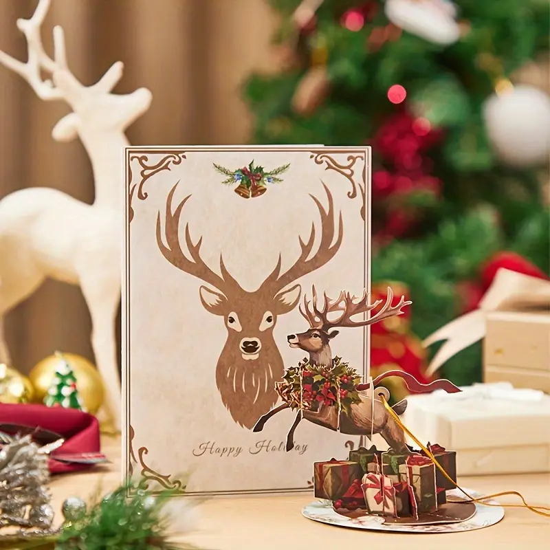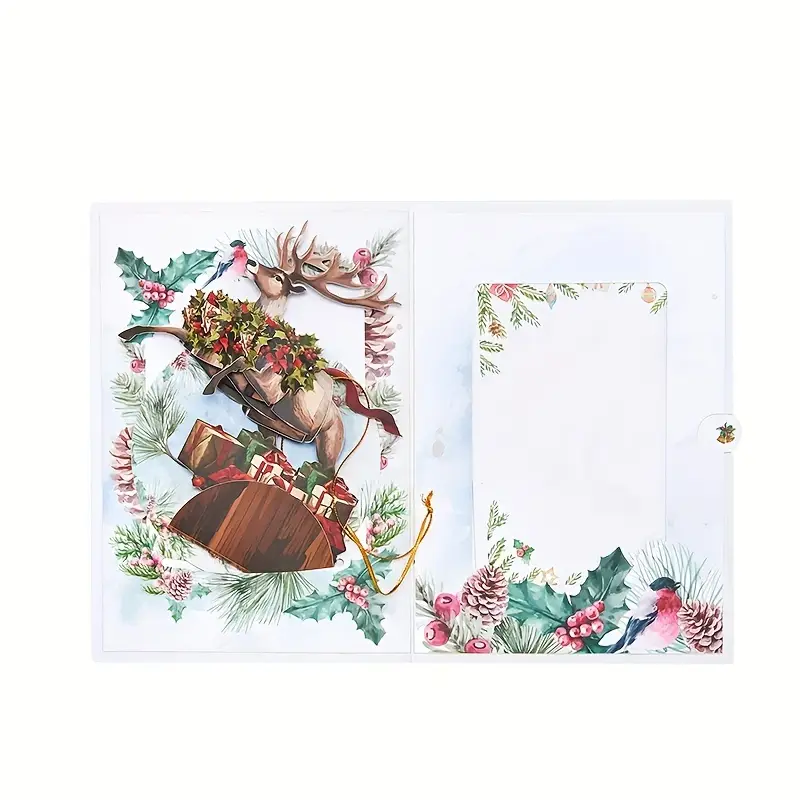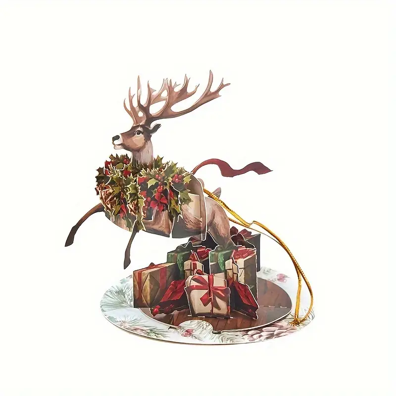 This is a charming Christmas – themed card and ornament. The card features a deer design, and when you take out the 3D deer element, it can be used as a Christmas tree ornament. The deer is adorned with a festive wreath and stands above beautifully wrapped gifts, exuding a strong holiday atmosphere. Such a creative item is perfect for adding a touch of Christmas magic to your tree and sending warm holiday wishes to others.