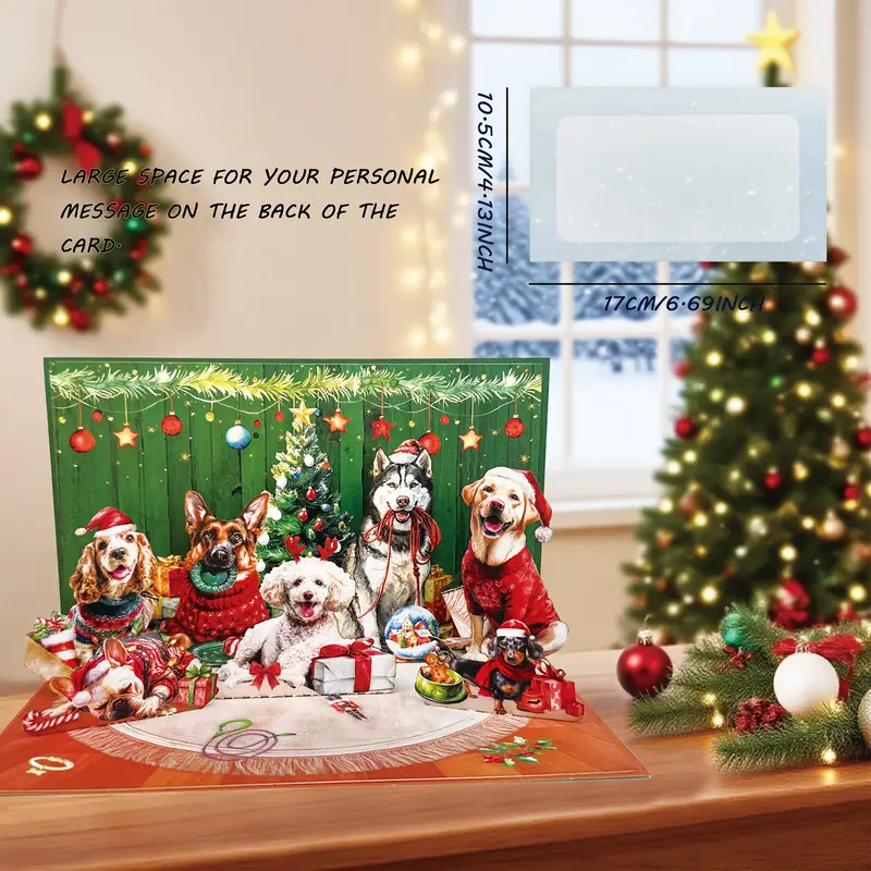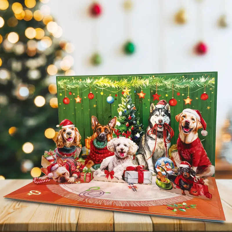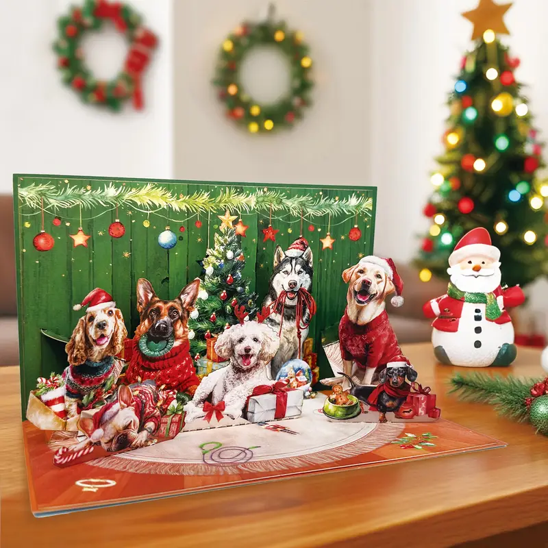 This 3D pop – up card features an adorable scene of dogs celebrating Christmas. Various dog breeds, all dressed in festive sweaters and Santa hats, gather around a decorated Christmas tree. There are gifts, a cozy rug, and Christmas ornaments like baubles and stars hanging above, creating a warm and joyful holiday atmosphere. It’s a perfect way to send Christmas greetings, bringing smiles with its cute canine characters and vivid 3D design.