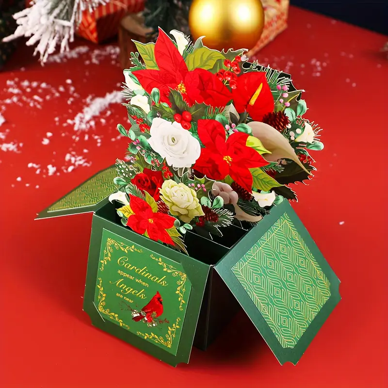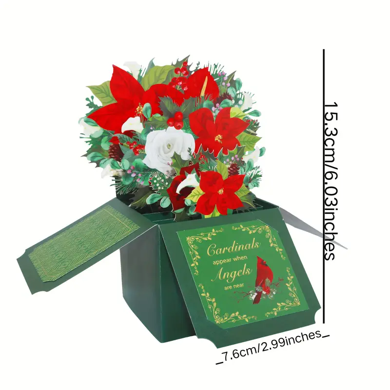 This pop – up box card unfolds to reveal a stunning bouquet of Christmas – themed flowers. Vibrant red poinsettias, elegant white roses, and other festive blooms, along with lush green leaves and berries, create a rich and colorful display. The green box features a decorative design and the heartwarming phrase “Cardinals appear when Angels are near”, adding a sentimental touch. Set against a festive red background with Christmas ornaments, it’s a perfect way to send holiday cheer, combining the beauty of flowers with the charm of a pop – up card.