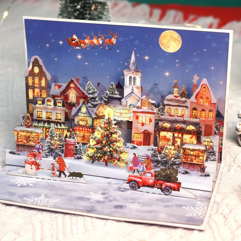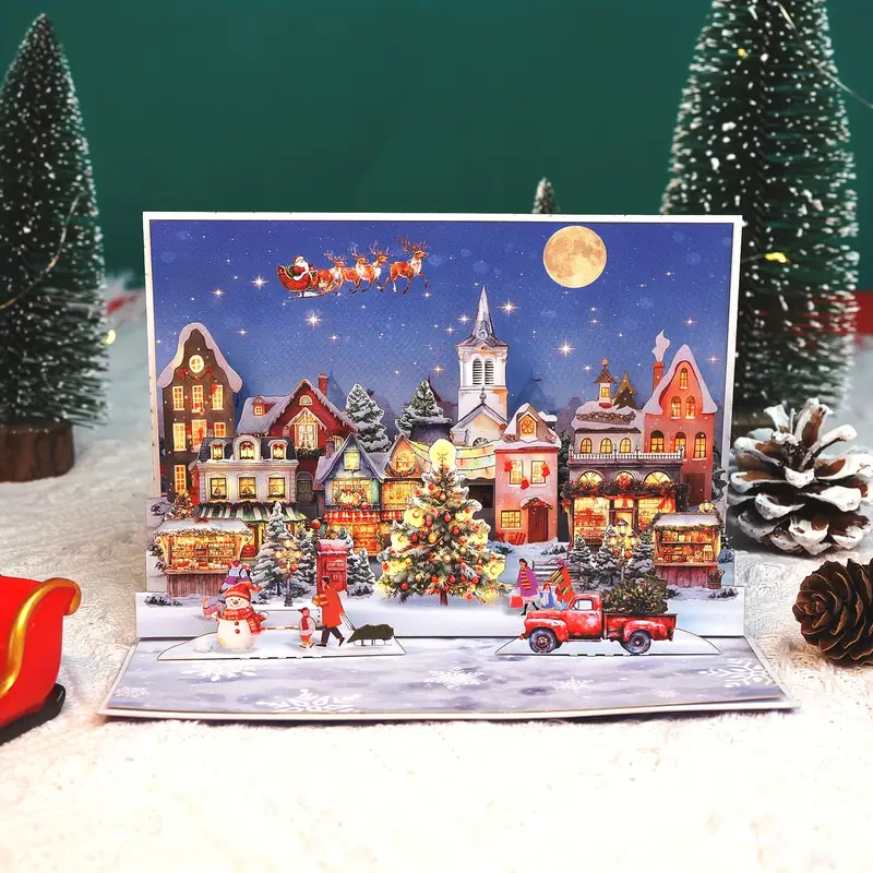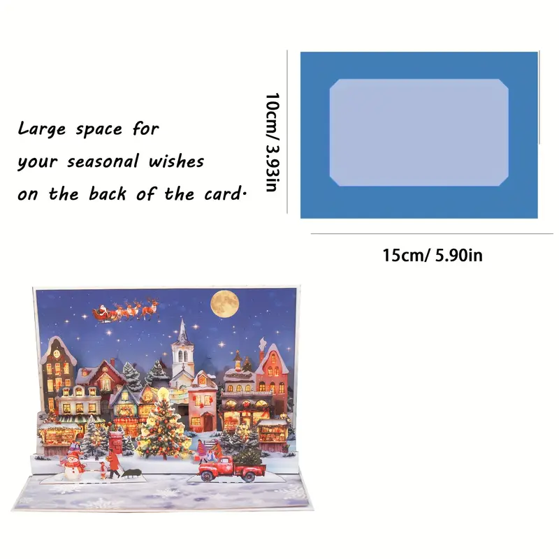 This 3D pop – up card depicts a magical Christmas town scene. When opened, it reveals a snowy village with brightly lit houses, a beautifully decorated Christmas tree, a red truck carrying a tree, and people enjoying the holiday—some building a snowman, others strolling. In the night sky, Santa Claus flies on his sleigh pulled by reindeer, with a full moon shining above. The card, measuring 15cm (5.90in) in width and 10cm (3.93in) in height, has a large space on the back for writing your seasonal wishes, making it a perfect choice for sending warm Christmas greetings.