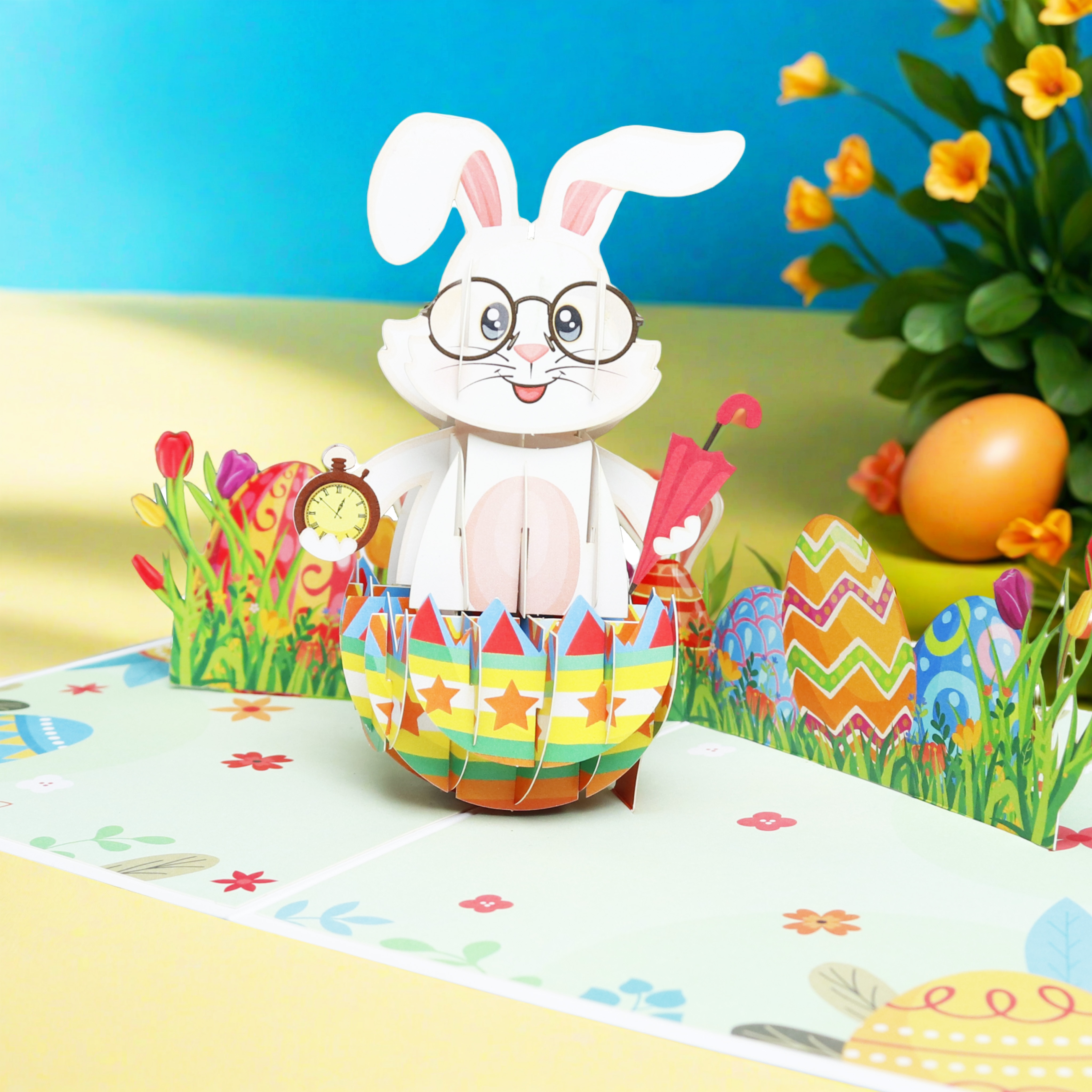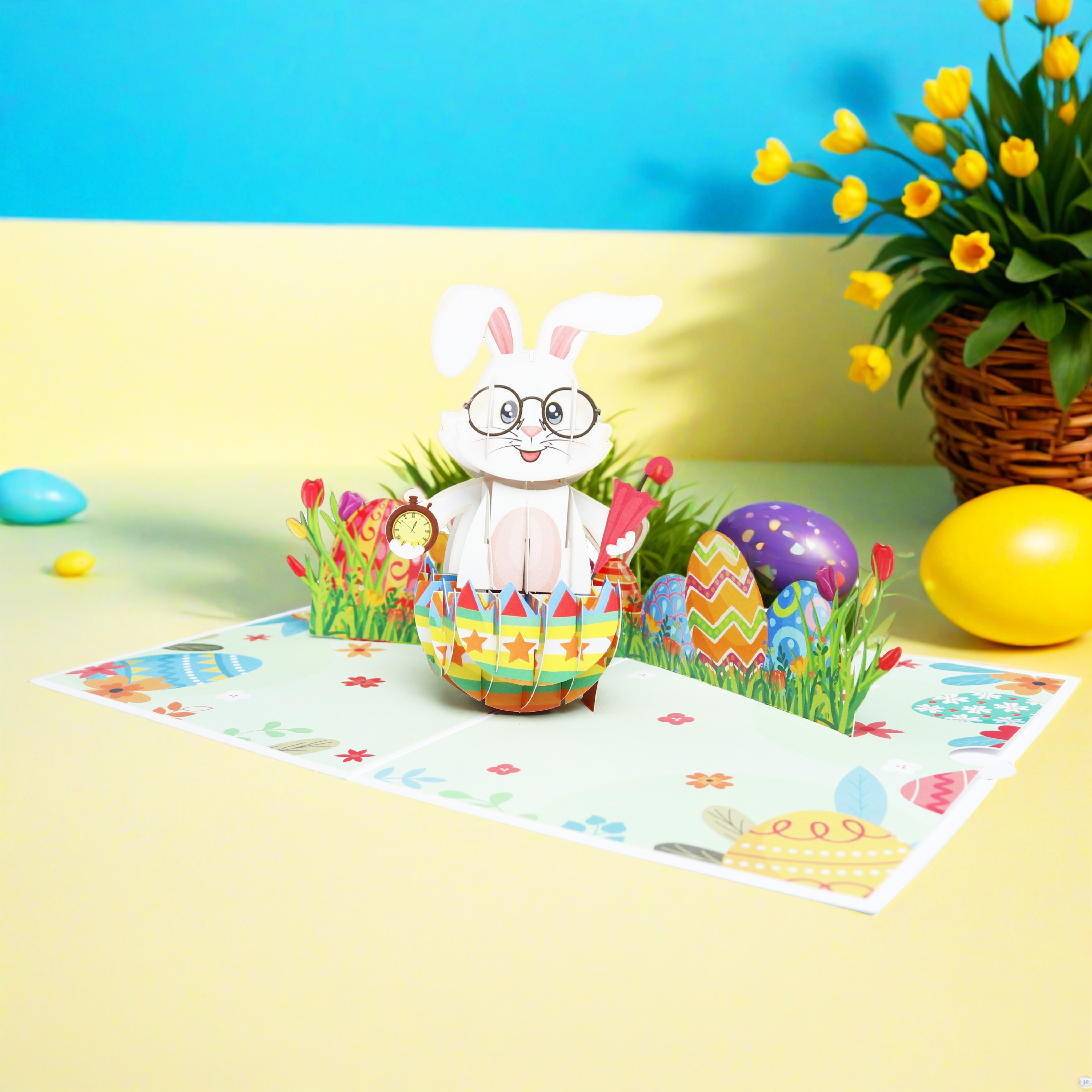 3D Pop-Up Easter Bunny Card: Features a glasses-wearing bunny in a colorful egg, paired with decorated eggs and spring floral details. The layered 3D design creates vivid festive vibes, ideal for Easter greetings. Doubles as a decorative table piece, 4×6 inches (includes envelope & protective sleeve). A charming, playful gift for kids and families to celebrate the Easter season.