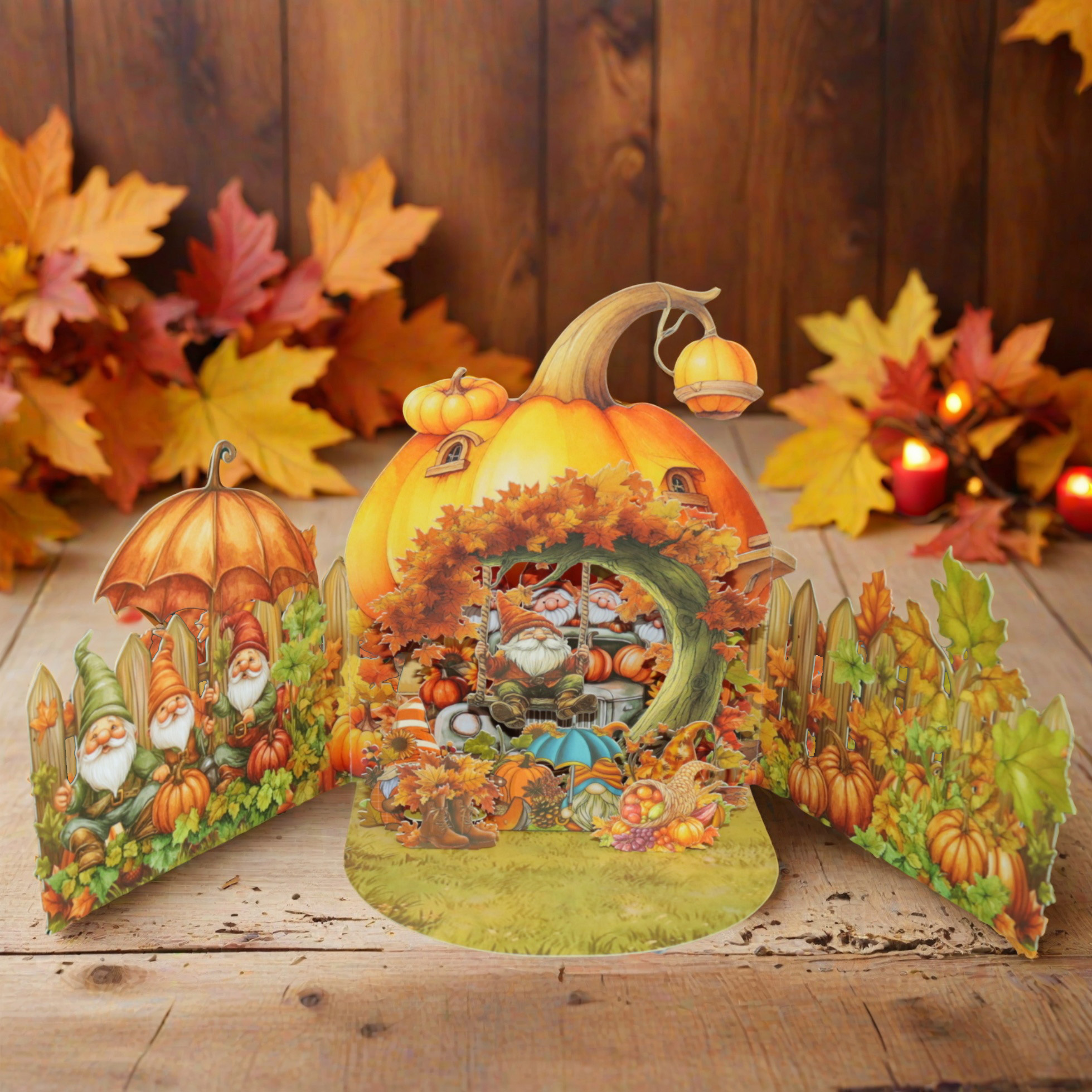 Autumn Gnome Pop-Up Card with Pumpkin House & Fall Scene Design