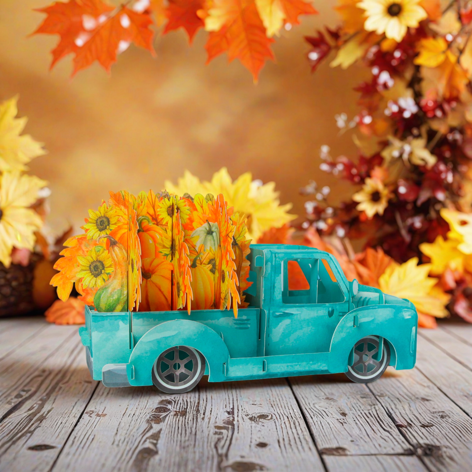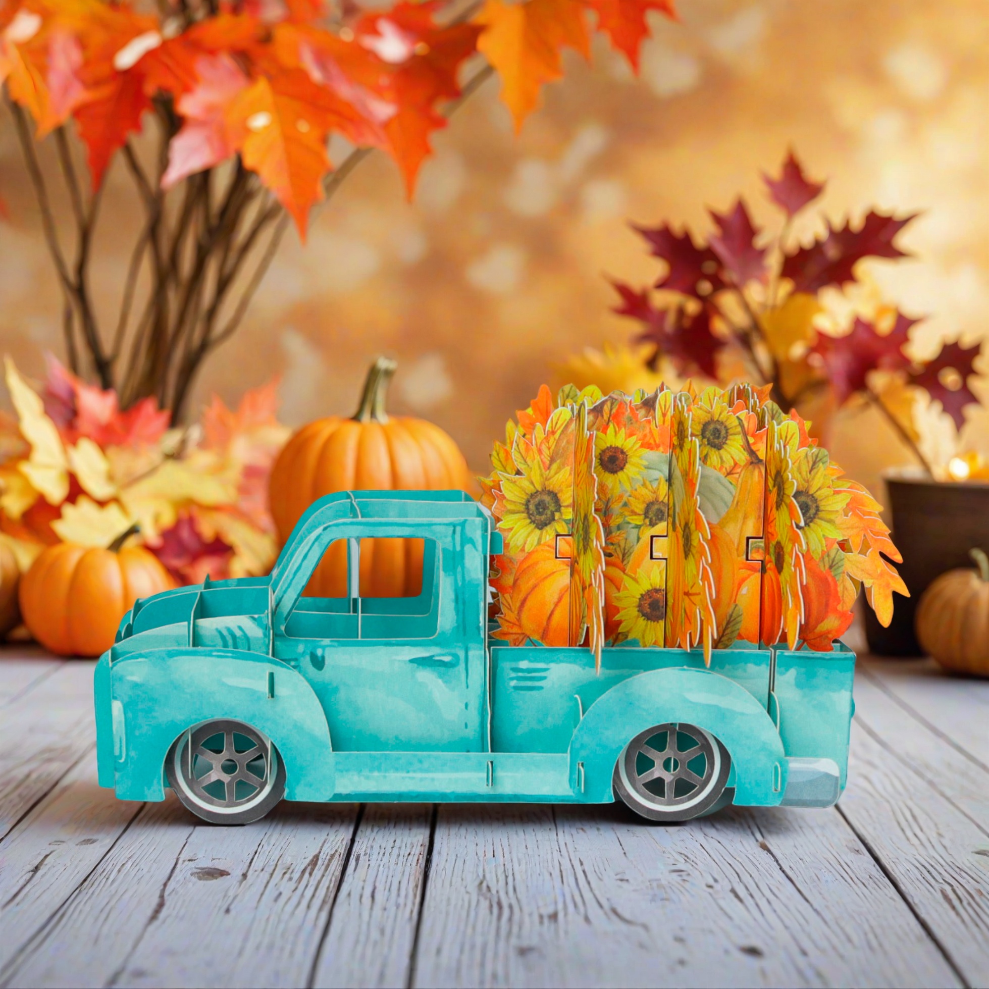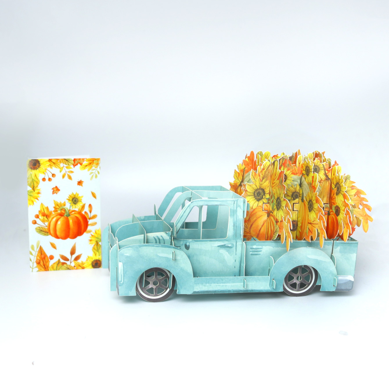 This is a charming 3D pop-up greeting card featuring a light blue vintage-style pickup truck. The truck is loaded with vibrant sunflowers and pumpkins, embodying the rich harvest elements of autumn. Beside it, there’s a matching card decorated with sunflowers, pumpkins, and autumn leaves, which complements the truck’s design perfectly. The entire set exudes a warm, festive autumn atmosphere, making it an ideal choice for celebrating fall occasions like Thanksgiving or simply sending seasonal greetings.