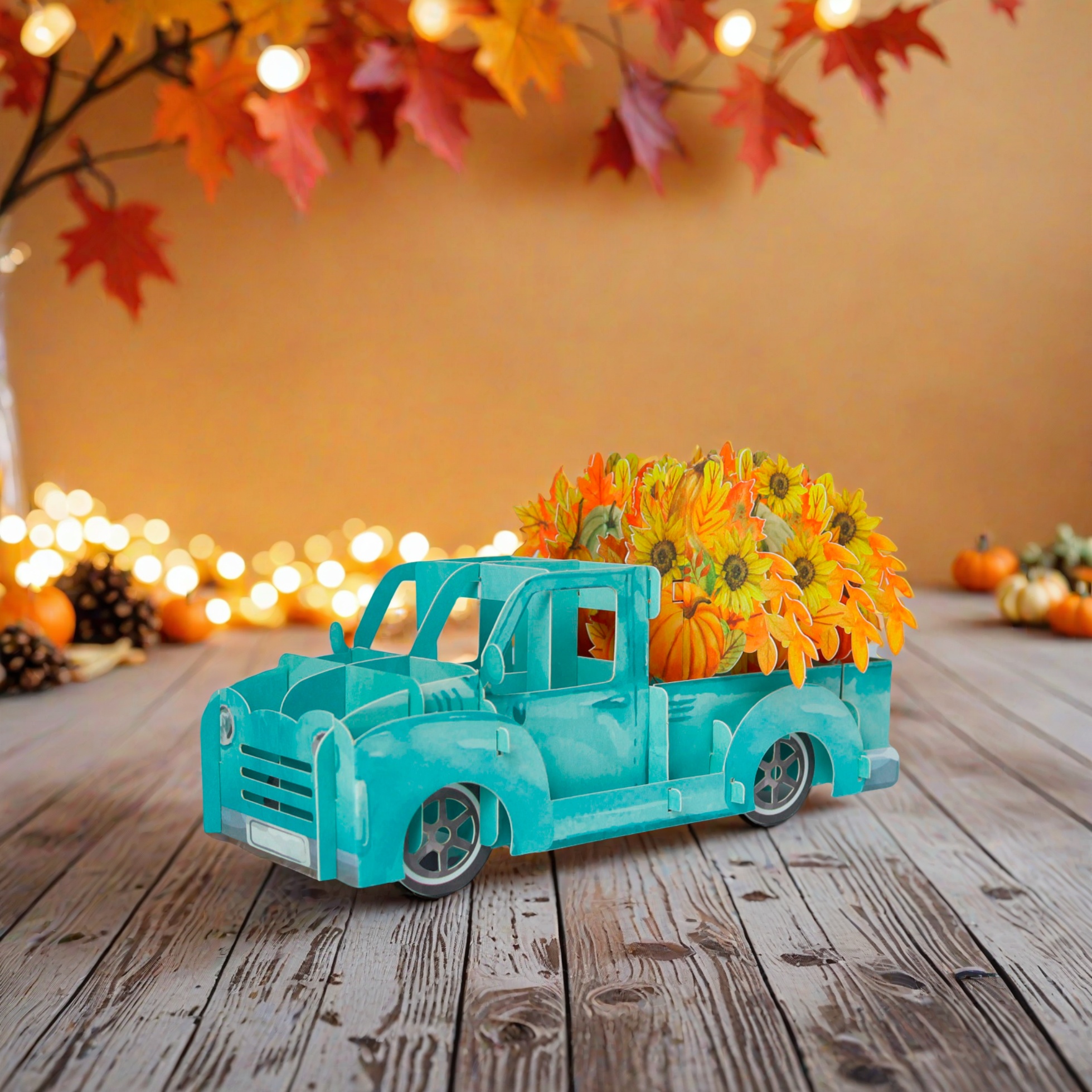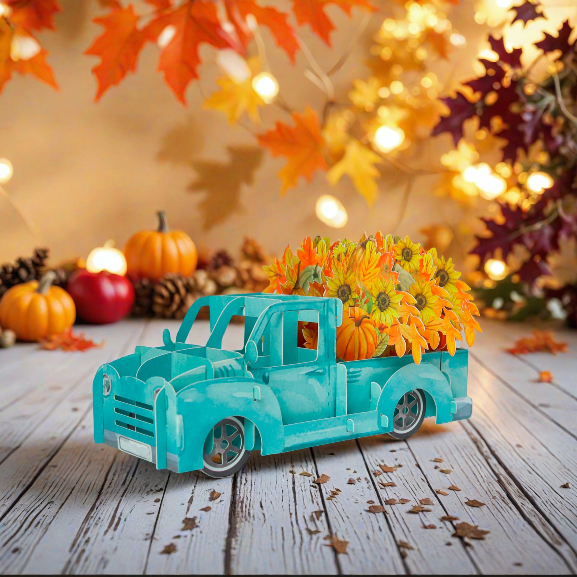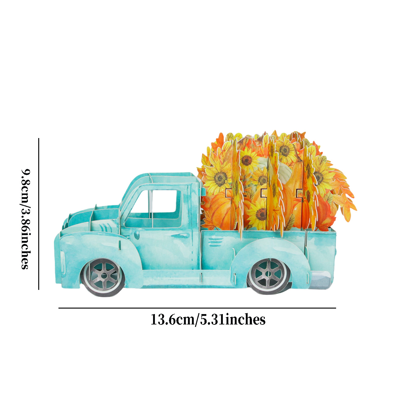 This is a charming 3D pop-up greeting card featuring a light blue vintage-style pickup truck. The truck is loaded with vibrant sunflowers and pumpkins, embodying the rich harvest elements of autumn. Beside it, there’s a matching card decorated with sunflowers, pumpkins, and autumn leaves, which complements the truck’s design perfectly. The entire set exudes a warm, festive autumn atmosphere, making it an ideal choice for celebrating fall occasions like Thanksgiving or simply sending seasonal greetings.