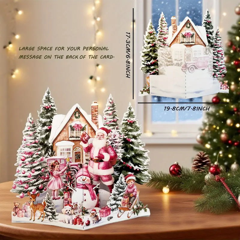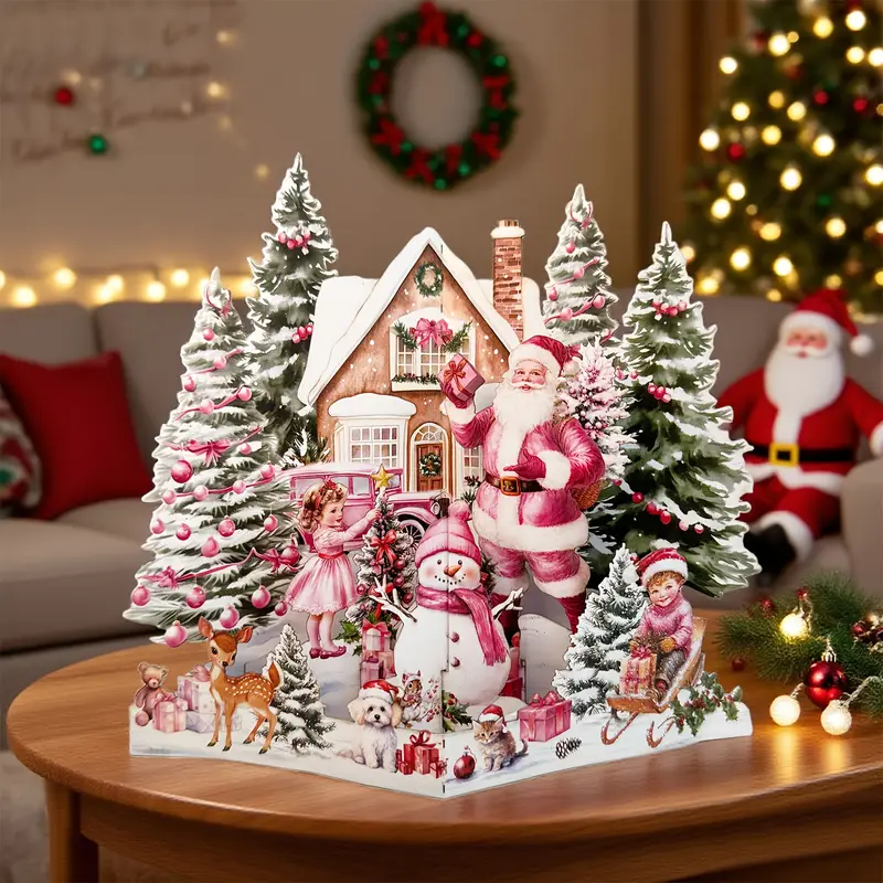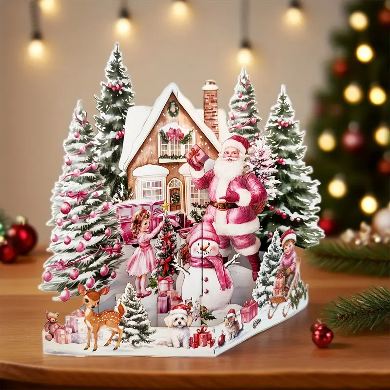 This decorative ornament showcases a charming Christmas scene. There’s a cozy house adorned with festive wreaths, surrounded by snow – capped Christmas trees decorated with pink baubles. Santa Claus, in his iconic red and white outfit, holds a gift, ready to spread joy. A cute snowman with a pink scarf, children enjoying the holiday—one decorating a tree, another sledding with presents—and lovely animals like a deer, a dog, and a cat add to the warm, festive atmosphere. It’s perfect for bringing the spirit of Christmas into your home, ideal for display on tables during the holiday season.