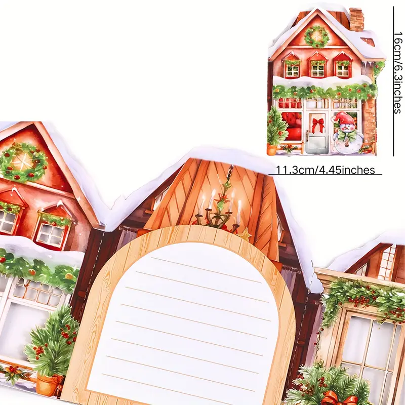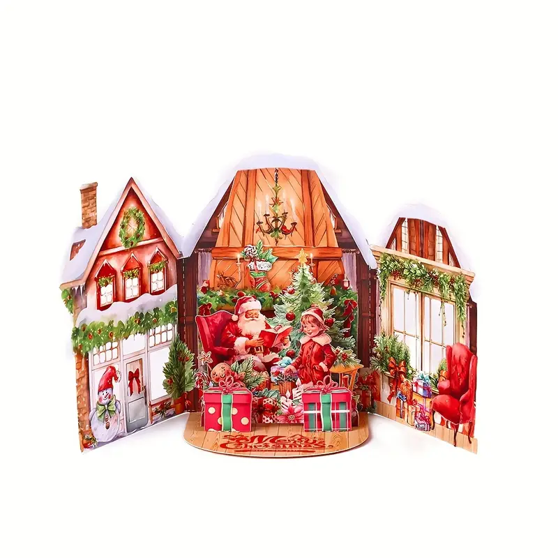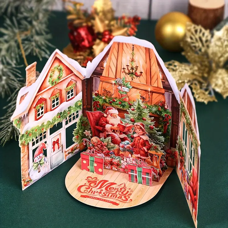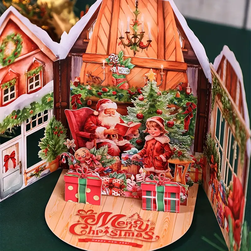 This is a vintage Christmas pop – up card. When ’tis opened, a vivid 3D scene doth appear. There is a cosy house adorned with Christmas wreaths, and snow lieth upon the roof. Within the house, Santa Claus sitteth comfortably, and a child is with him. About them, there is a beautifully decked Christmas tree, and many colourful gift boxes are placed here and there, creating a warm and festive Christmas atmosphere.